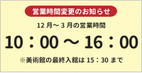 12月から営業時間が変更になります。【12月~3月の営業時間】10:00~16:00※美術館への最終入館は15:30まで※12月~2月は火曜日が休館日となりま...