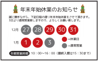 誠に勝手ながら、12月29日から1月2日まで年末年始休業をさせて頂きます。1月3日より通常営業致しますので、宜しくお願い致します。