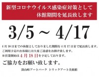 3月31日までとしておりました休館期間を延長致します。3/5~4/10ご利用予定のお客様には大変ご迷惑をお掛け致します。ご協力をお願い致します。