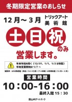 深山峠アートパークのWEBサイトをご覧いただき、ありがとうございます。12月~3月の冬期期間中、土日祝のみトリックアート美術館を営業する事にな...