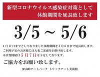 4月17日までとしておりました休館期間を延長致します。3/5~5/6ご利用予定のお客様には大変ご迷惑をお掛け致します。ご協力をお願い致します。※営...