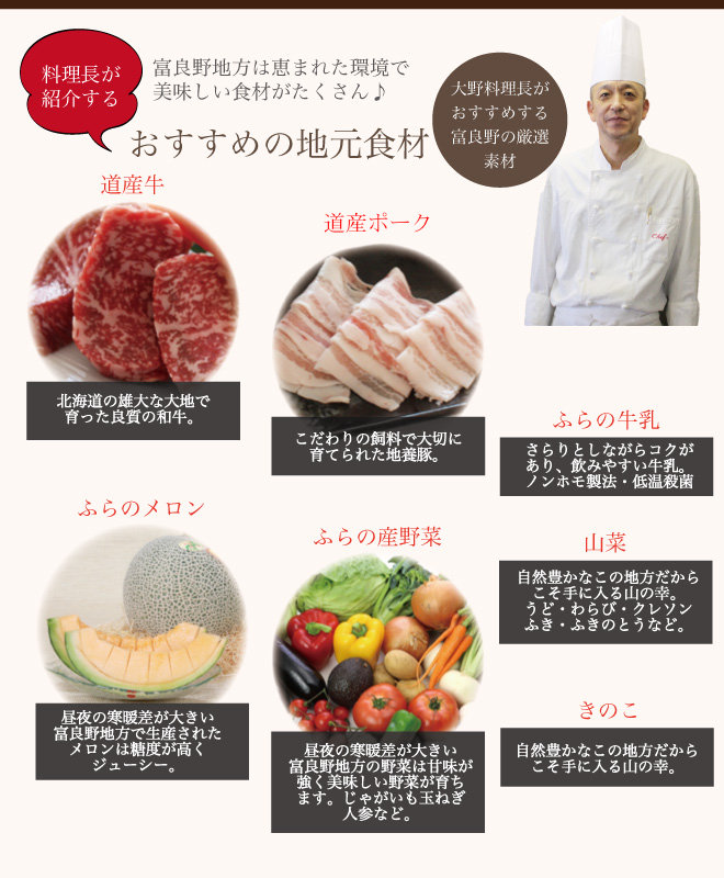 富良野産の野菜をはじめ、様々な地元の食材を使用しています。